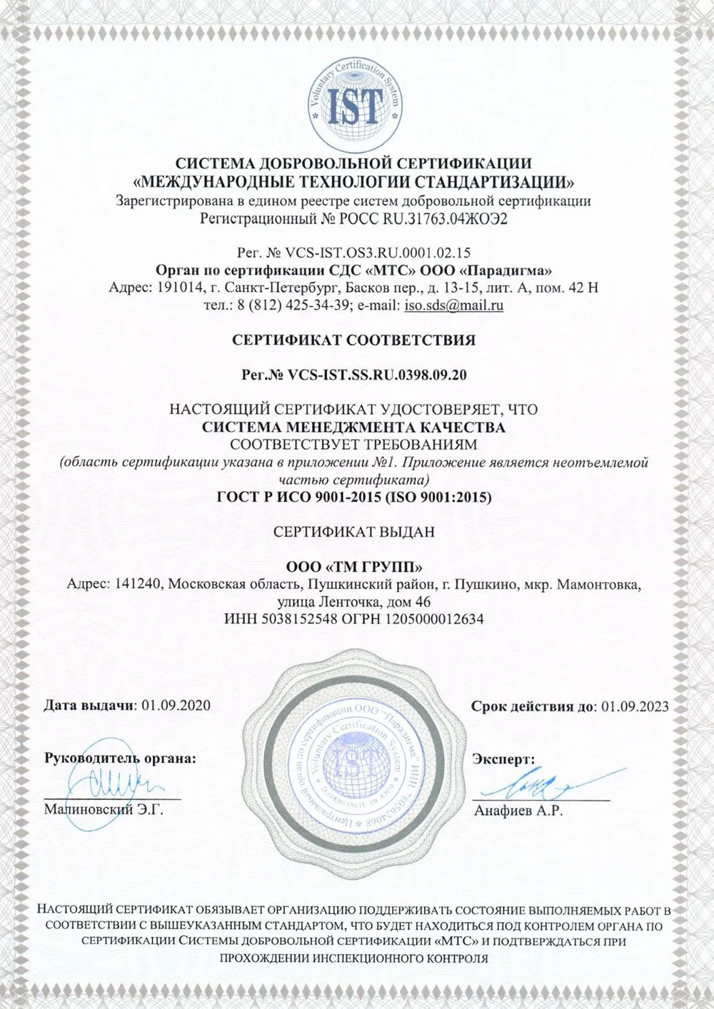 Для TM Group/ТМ Групп важно, чтобы процессы управления и производства продолжали совершенствоваться, поэтому система менеджмента сертифицирована по стандарту ISO 9001.
