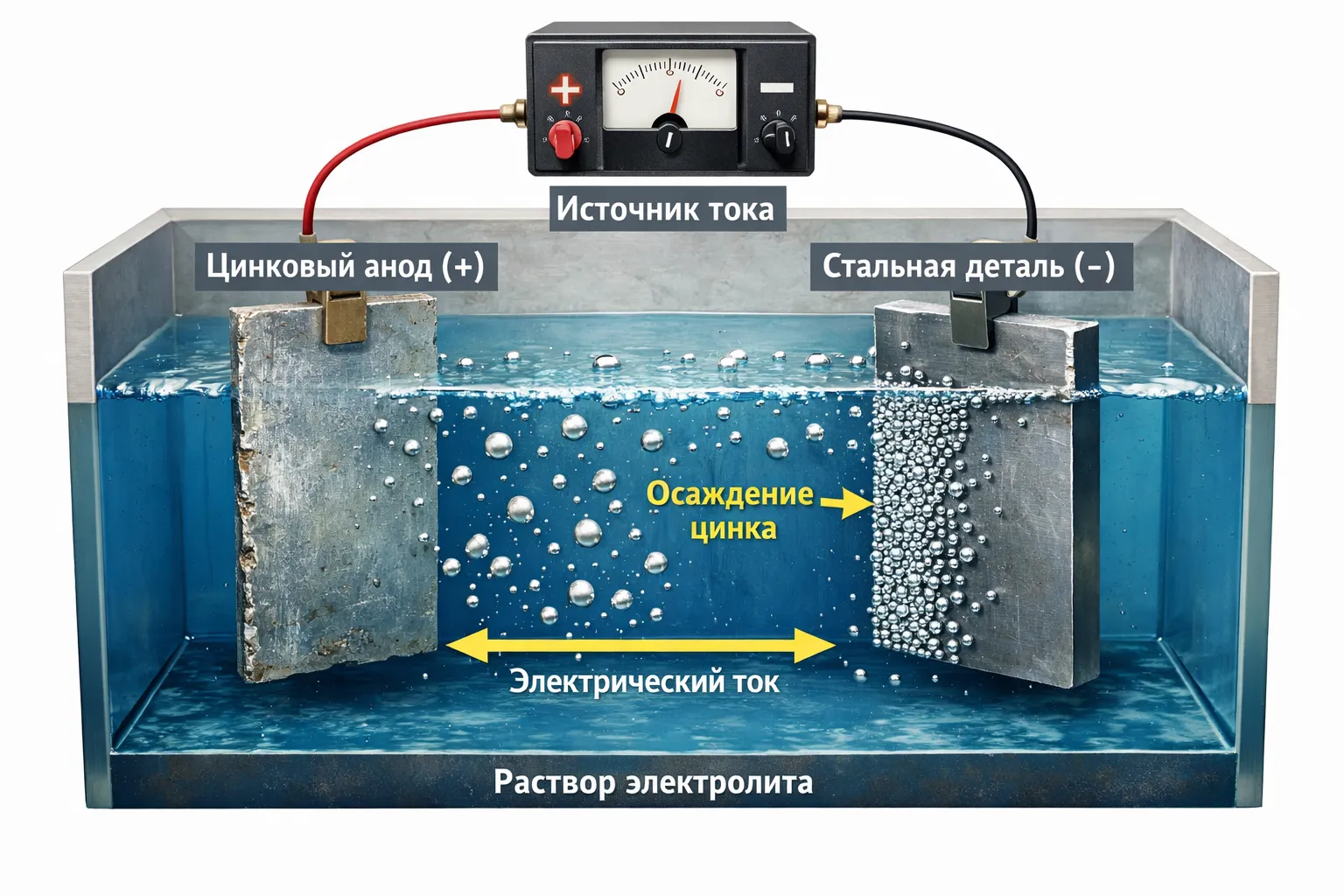 Под действием электрического тока происходит осаждение цинка — на катоде (изделии), при этом анод - это цинковый элемент.