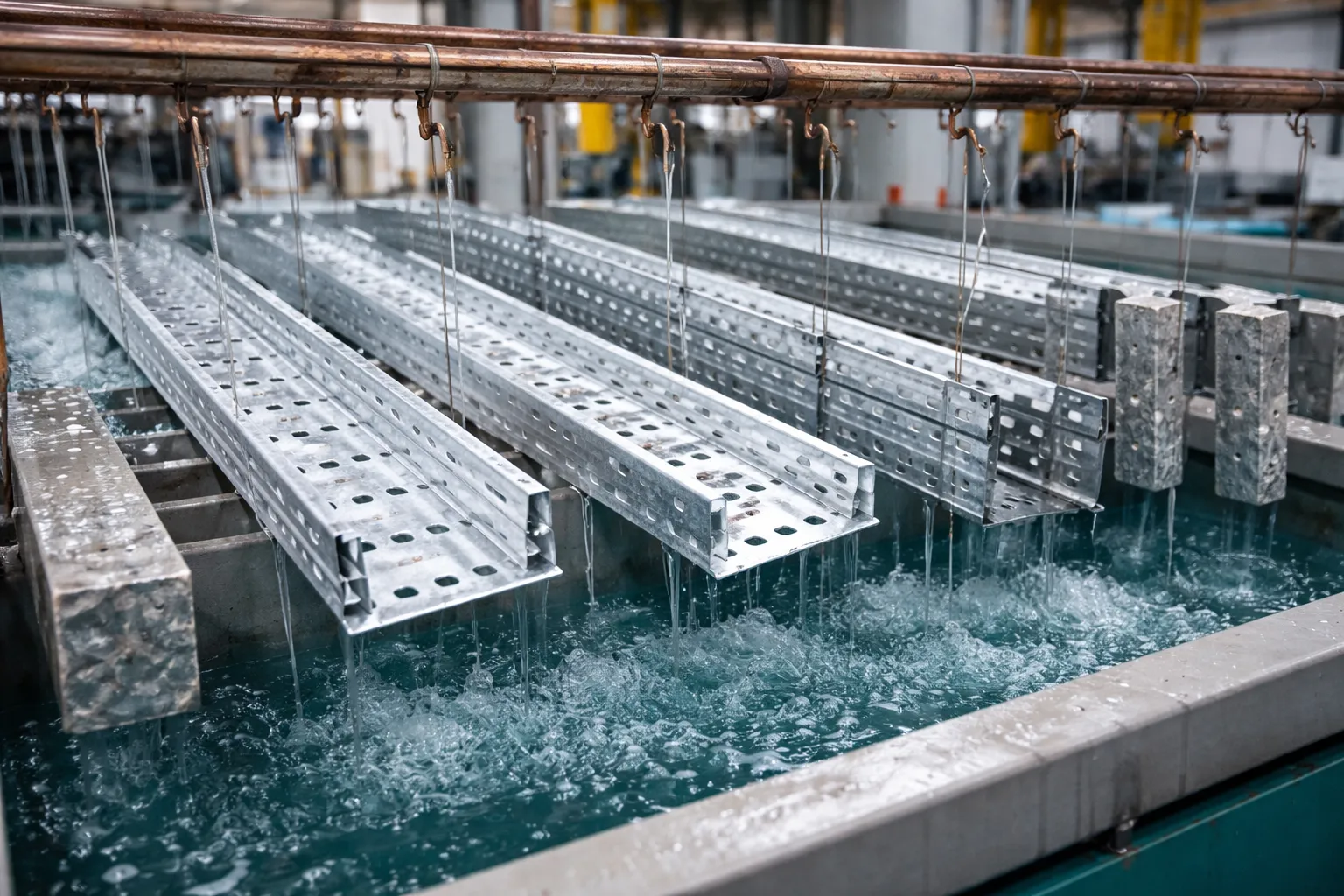 Для кабельных лотков, профилей, стоек и несущих конструкций применяется горячее цинкование металла, так как оно обеспечивает: